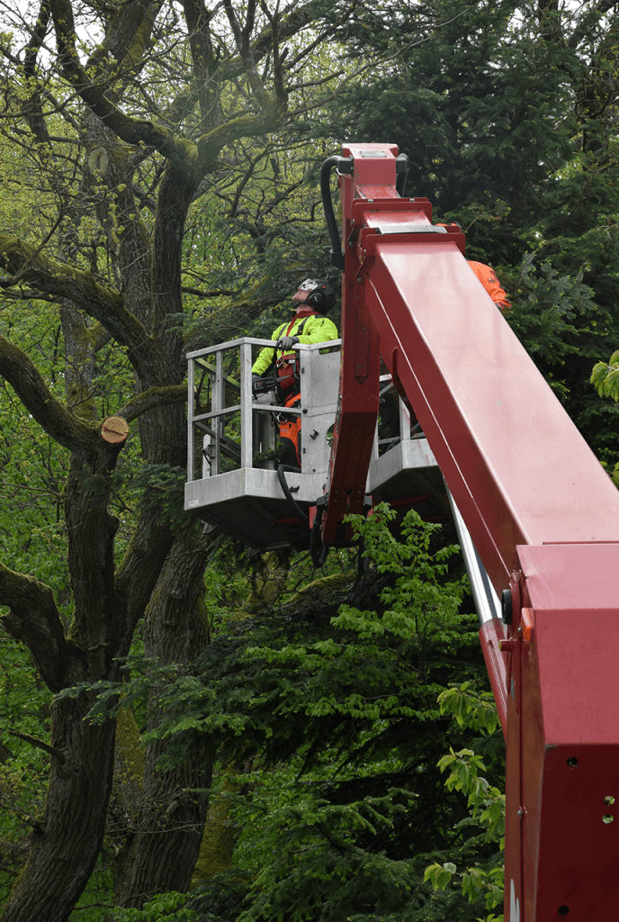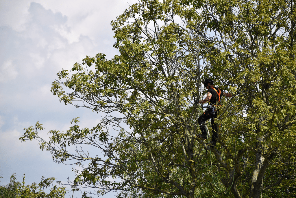 Mit der Seilklettertechnik können auch schwer zugängliche Bäume gepflegt oder auch gefällt werden. Die direkte Umgebung wird dabei geschont und der Lärmpegel auf ein Minimum reduziert.