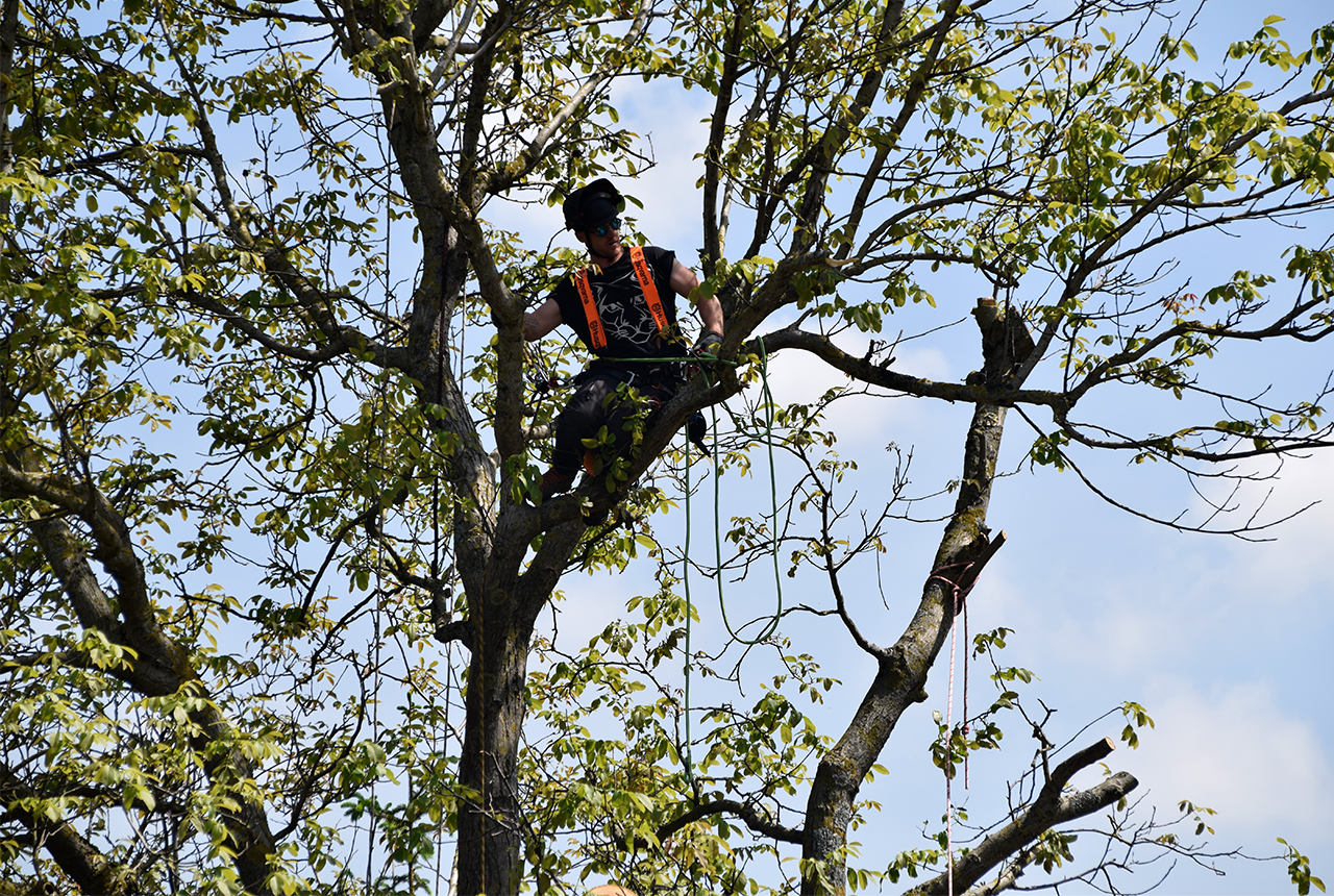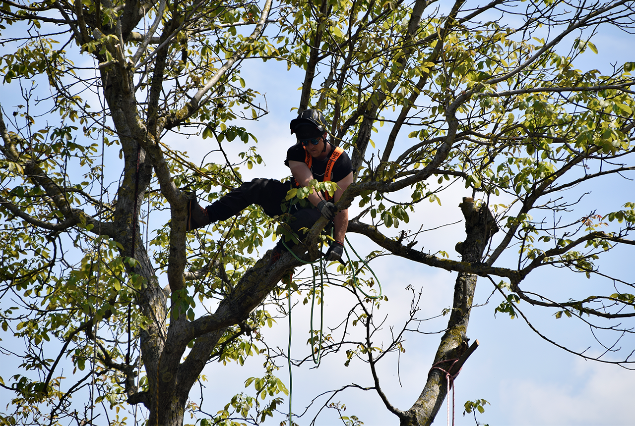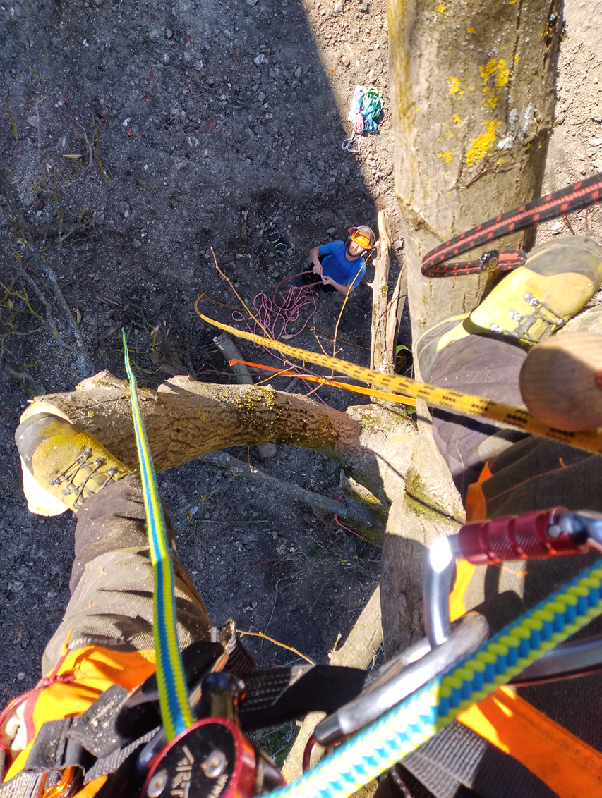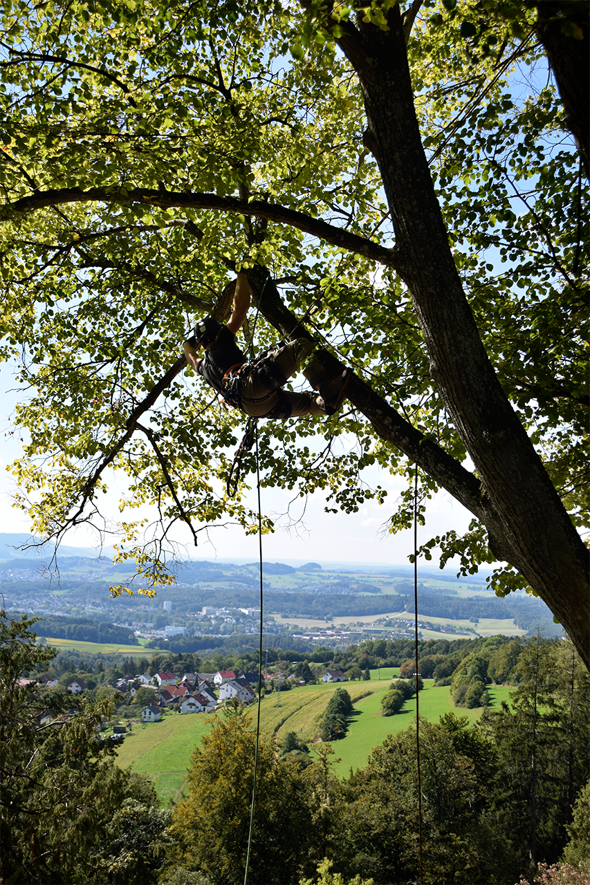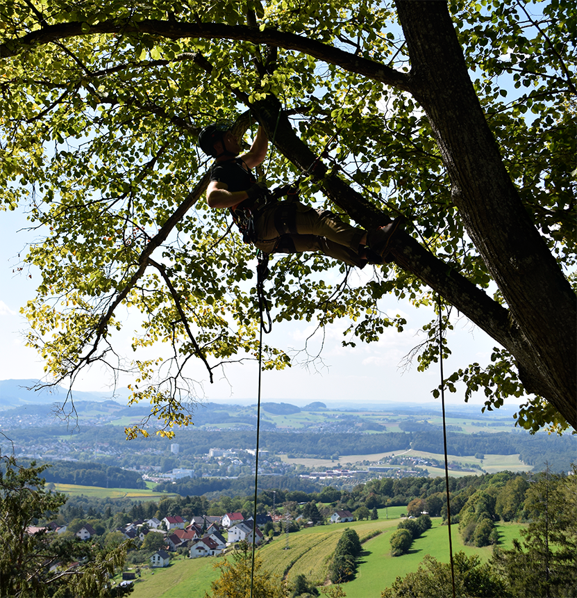 Mit der Seilklettertechnik können auch schwer zugängliche Bäume gepflegt oder auch gefällt werden. Die direkte Umgebung wird dabei geschont und der Lärmpegel auf ein Minimum reduziert.